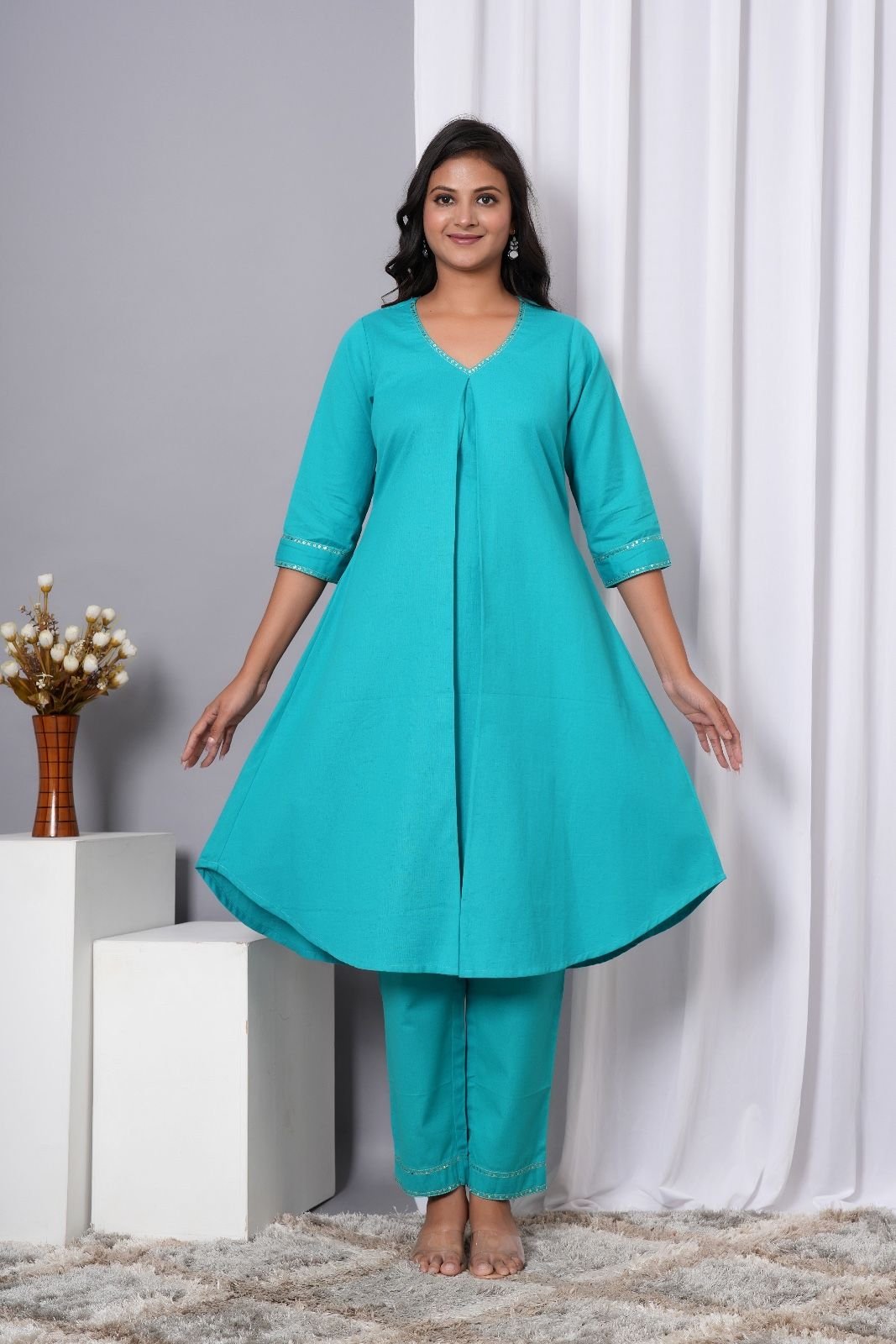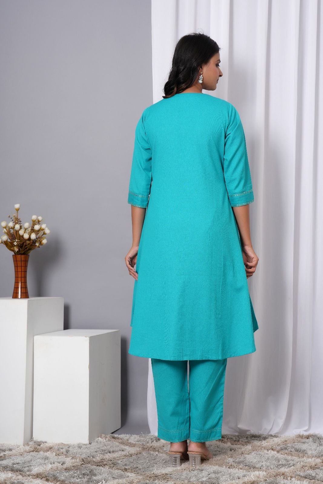 Bring elegance and comfort together with this Teal Blue Kurti with Pants Set. The kurti is designed in a graceful A-line silhouette with a subtle front pleat, adding flow and sophistication to your look. The V-neckline and three-quarter sleeves are highlighted with delicate handwork detailing, giving it a refined finish.