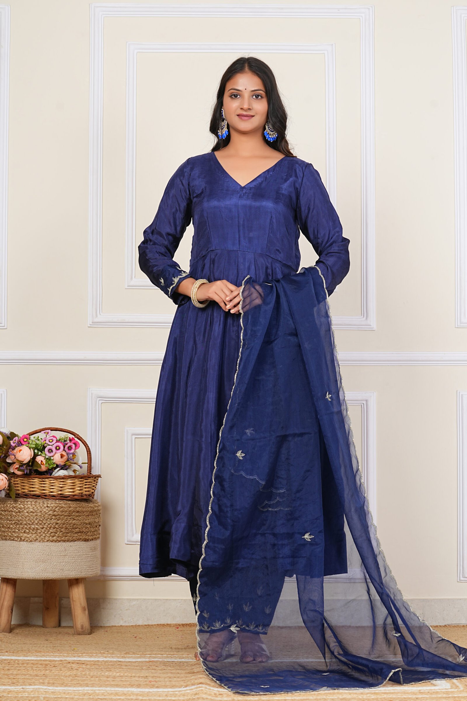 This exquisite royal blue Anarkali set, crafted from luxurious silk and organza , offers a blend of traditional elegance and contemporary style.