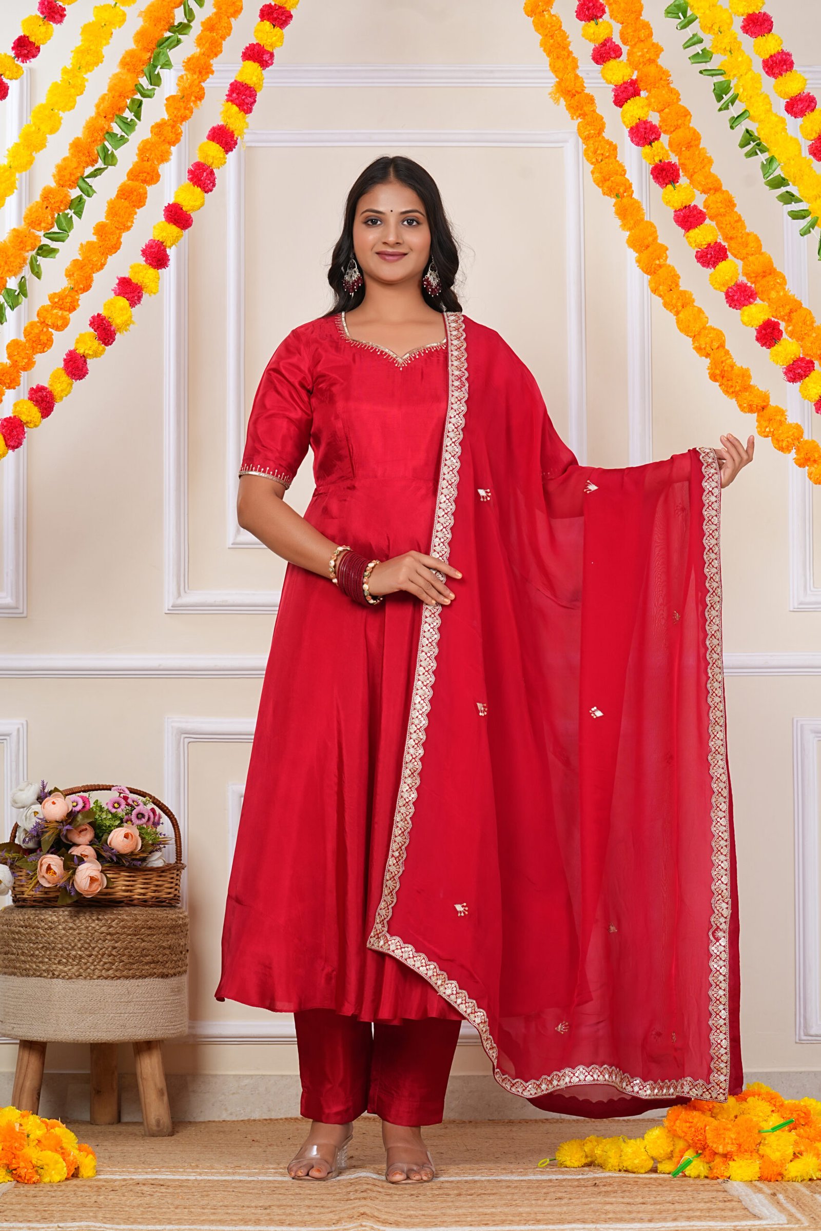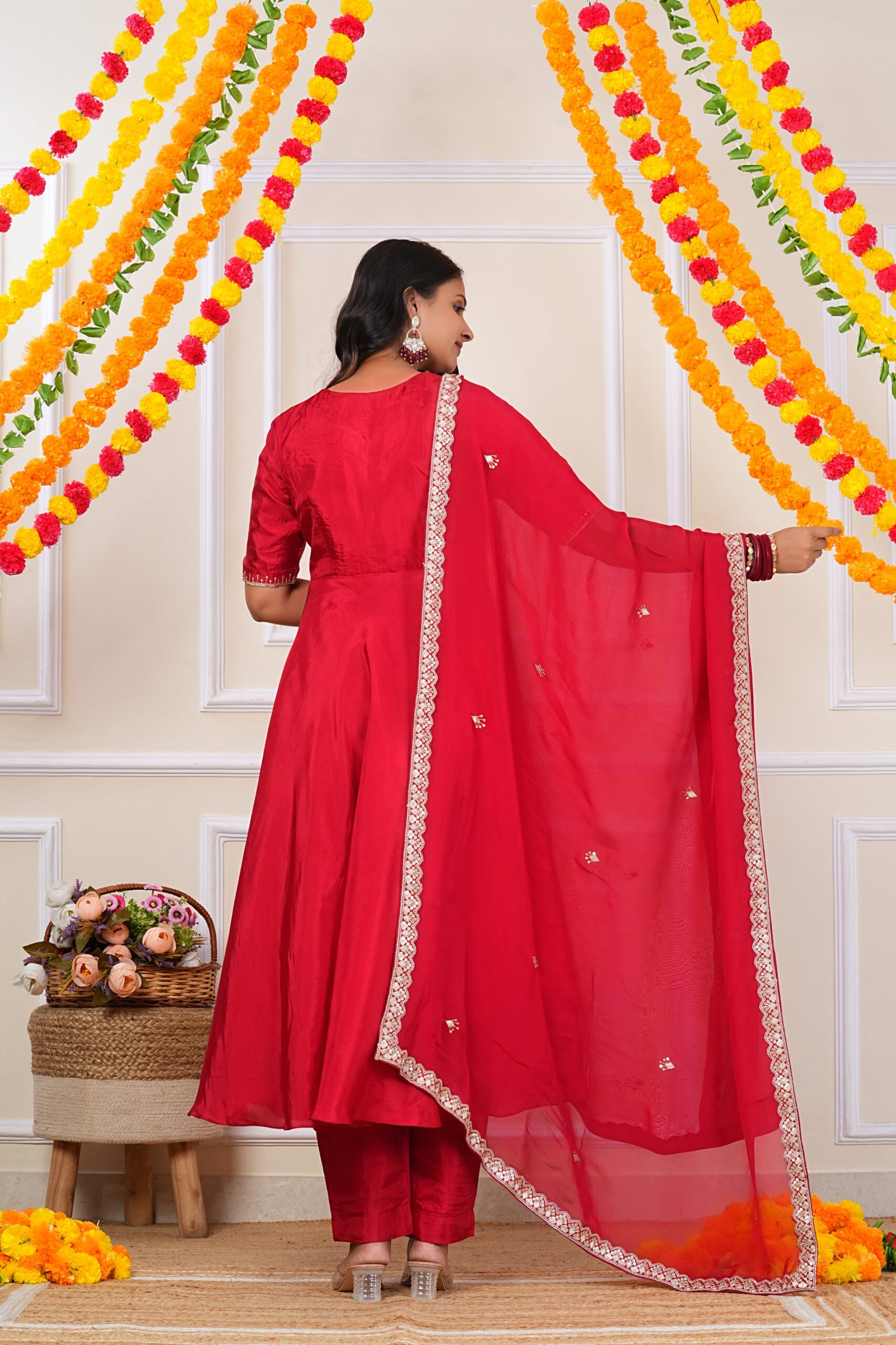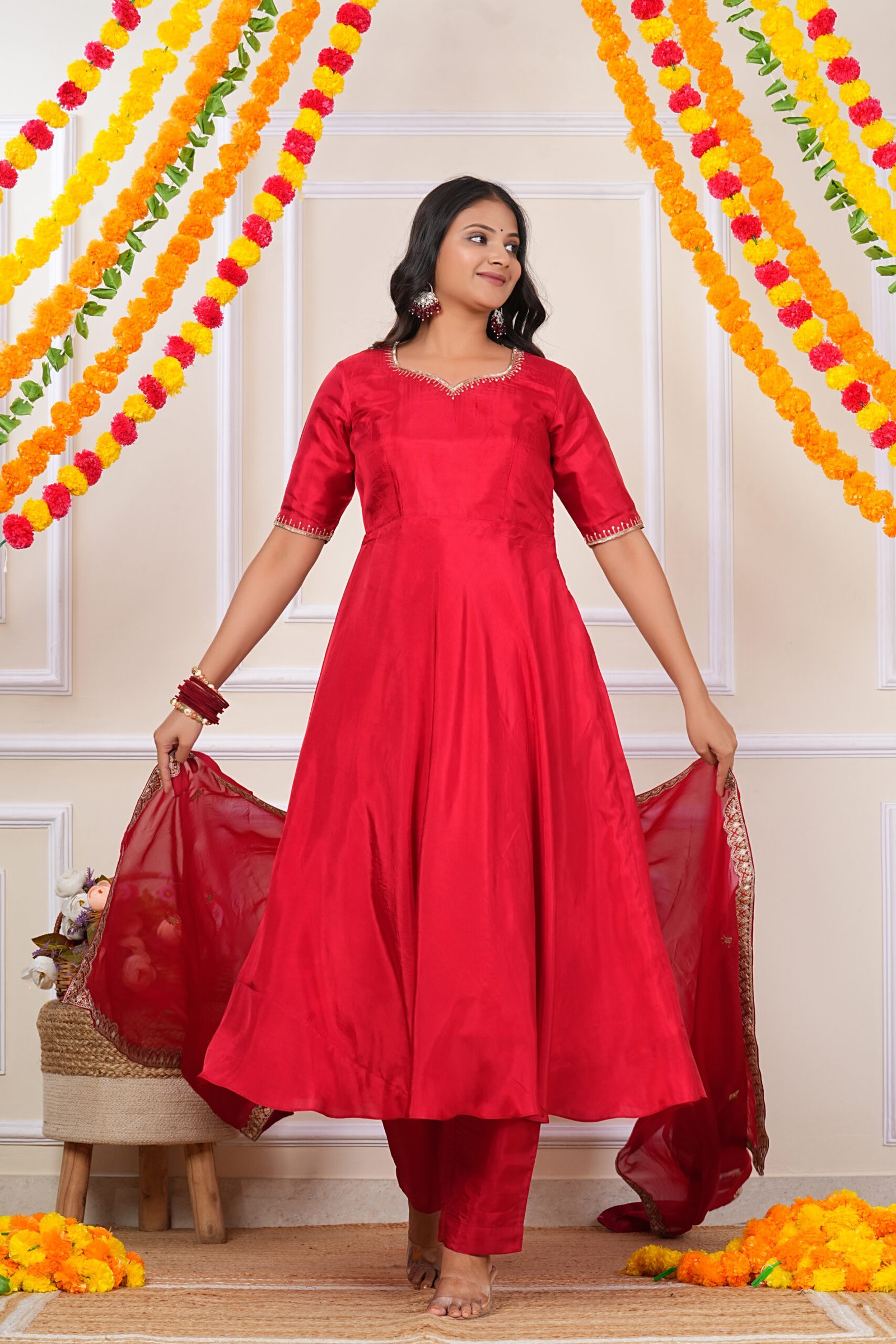 Drape yourself in elegance with this Classic Red Silk Anarkali Set, a timeless ensemble designed for festive charm. The rich silk Anarkali kurta features a flattering fit-and-flare silhouette with half sleeves and handwork embroidery along the neckline and sleeves. It is paired with matching straight-fit silk pants for comfort and style. The sheer red dupatta, highlighted with an intricately embroidered border and dainty motifs, adds the finishing touch of sophistication.