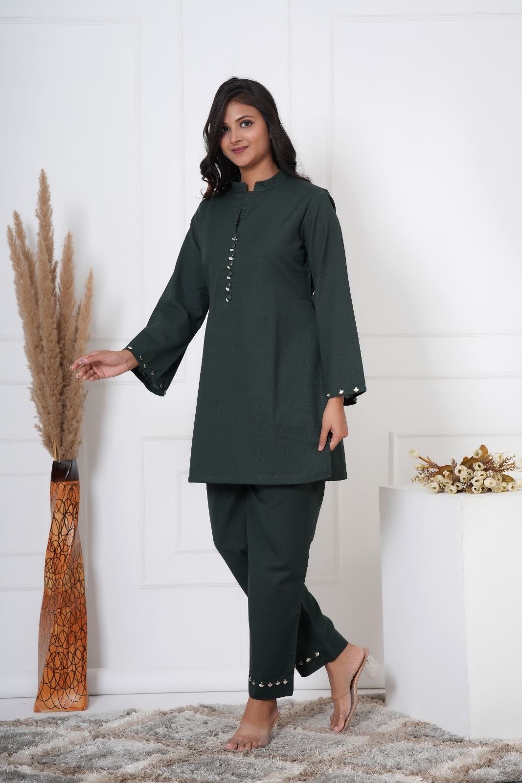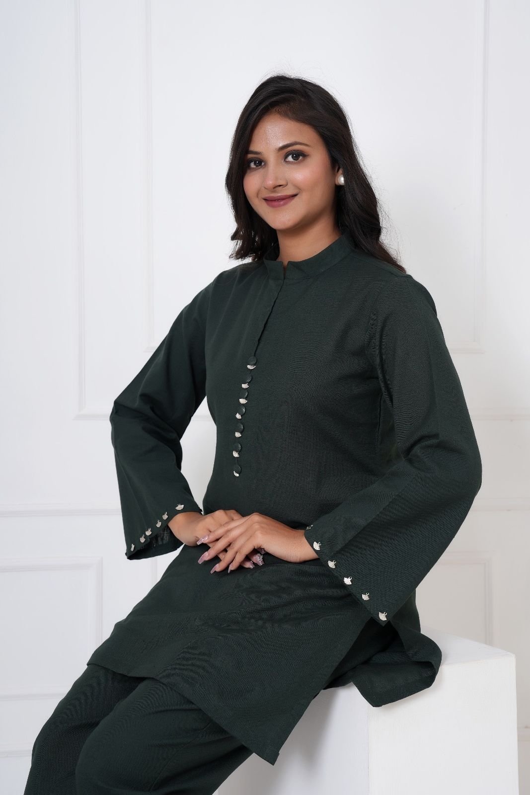 Keep it classic yet stylish with this elegant Dark Green Kurti Palazzo Set, perfect for both everyday wear and semi-formal occasions. The straight-fit kurti features a smart band collar with a notched neckline and a line of delicate metallic buttons on the front, adding a chic touch. Full-length sleeves with matching button accents at the cuffs enhance its sophistication.