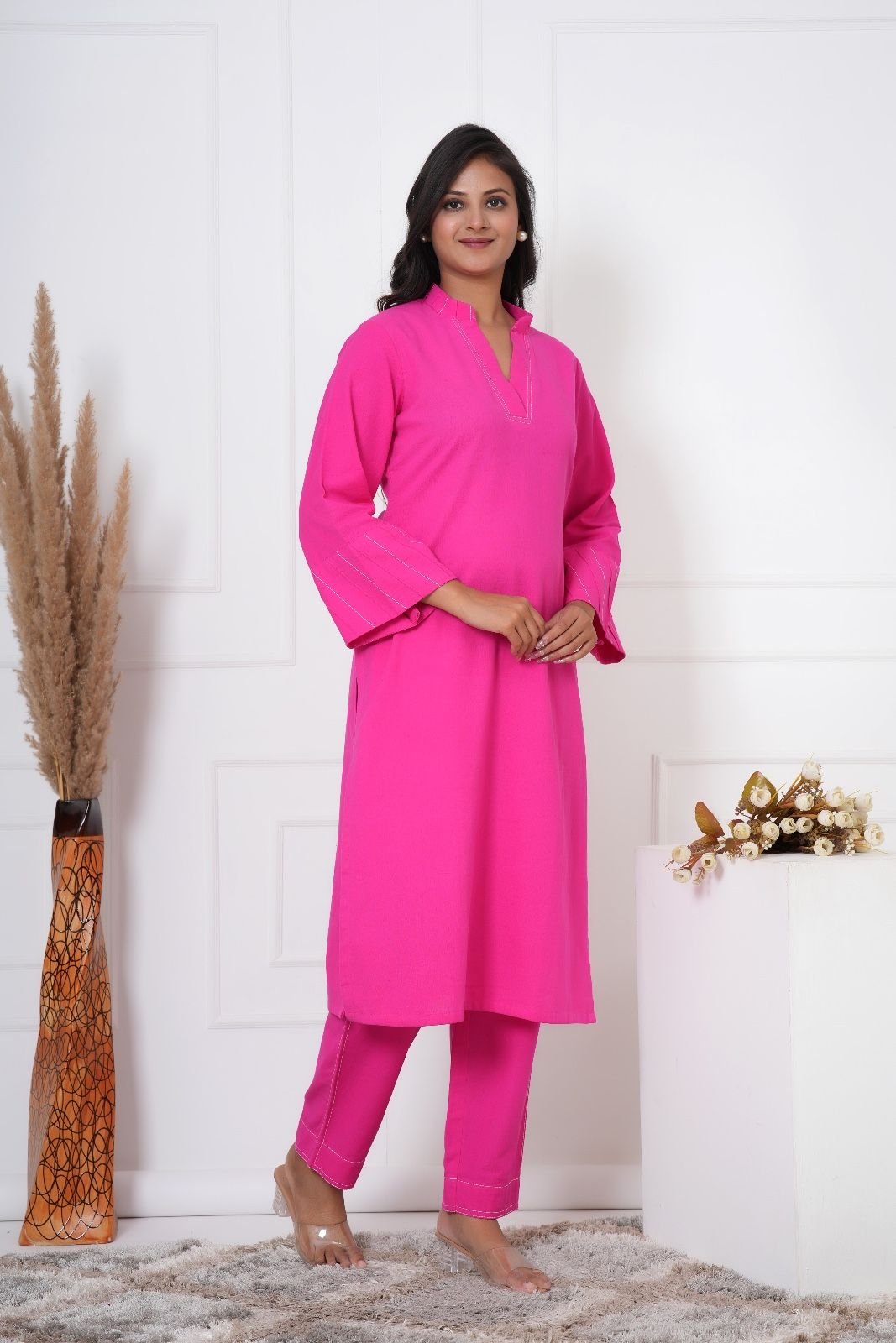 Add a vibrant pop of color to your wardrobe with this stunning Hot Pink Kurti Palazzo Set. The kurti features a straight-fit silhouette with a smart band collar and a notched neckline, giving it a chic and modern edge. Full-length sleeves with subtle stitched detailing add elegance to the overall design.