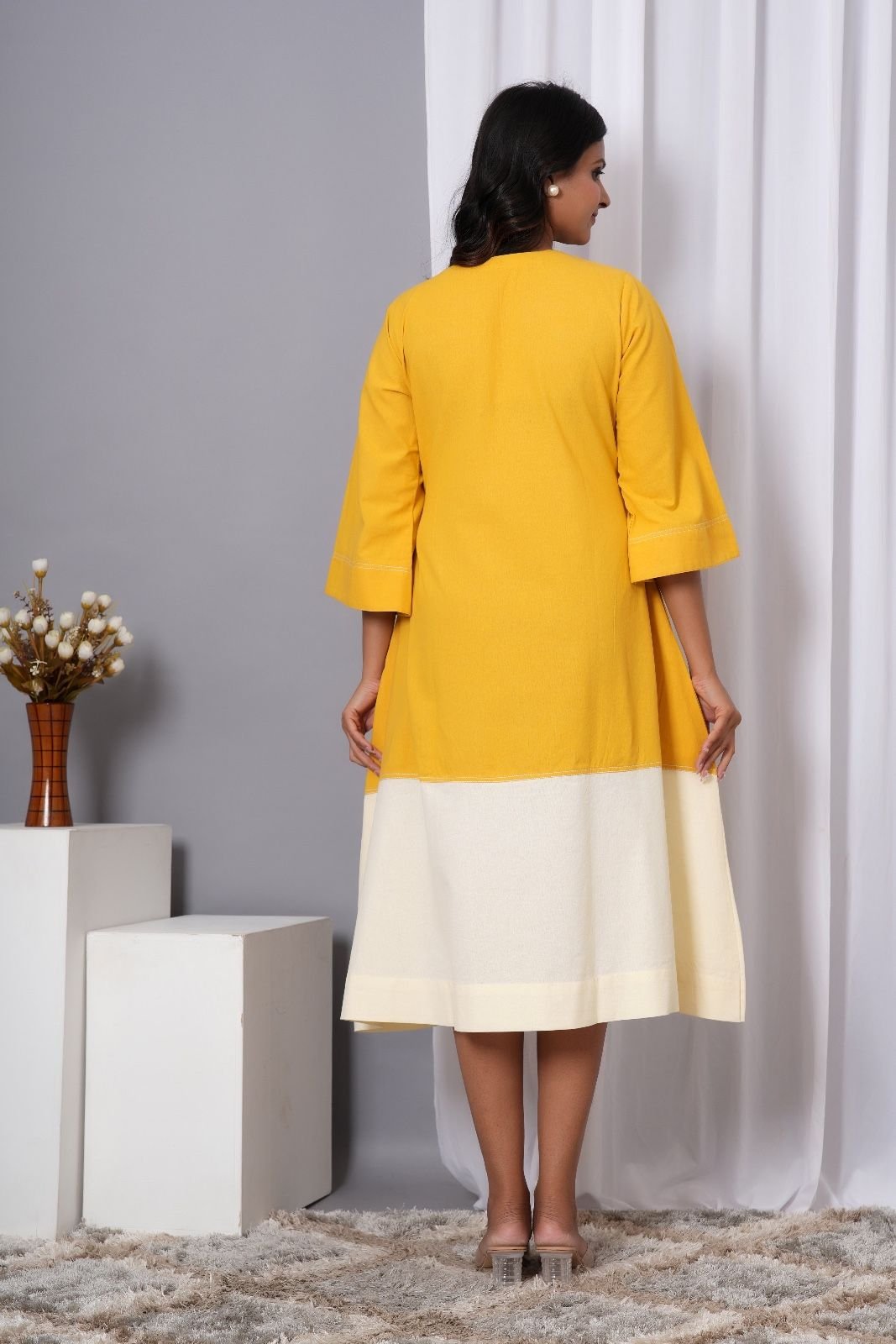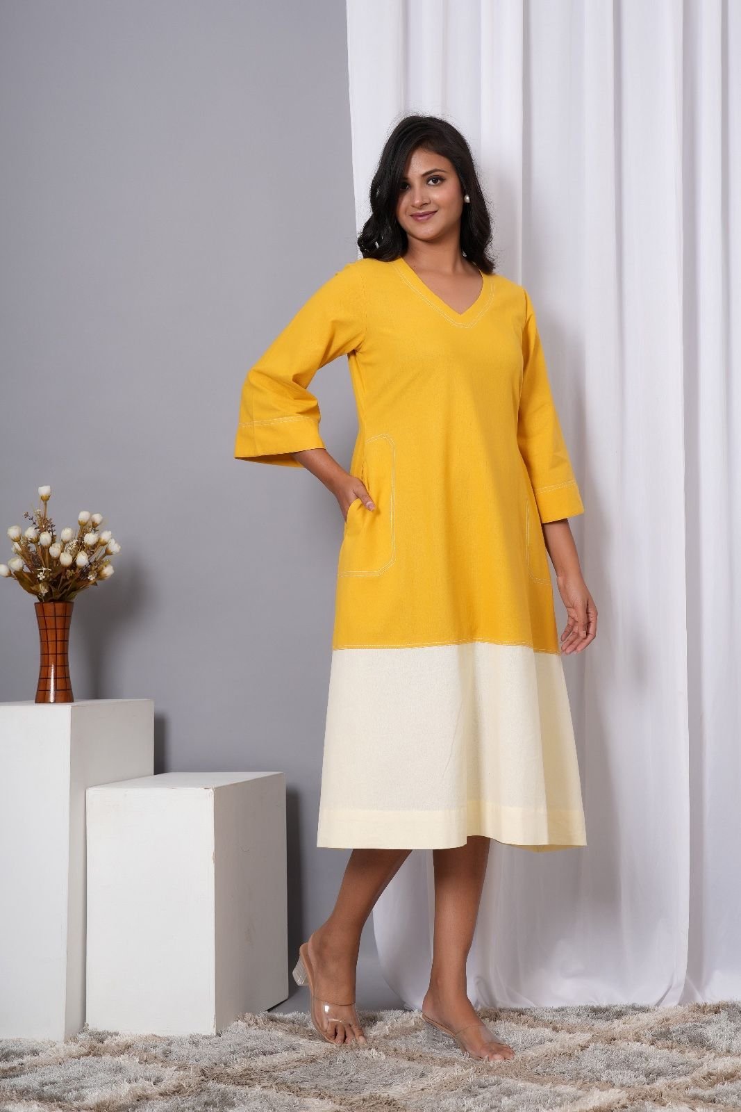 Brighten up your wardrobe with this Yellow & White Colorblock Midi Dress, designed for effortless style and everyday comfort. Featuring a flattering V-neckline and relaxed A-line silhouette, this dress brings together elegance and ease. The vibrant yellow top half transitions into a soft white hem, creating a chic two-tone effect that’s perfect for casual outings, brunch dates, or relaxed gatherings.